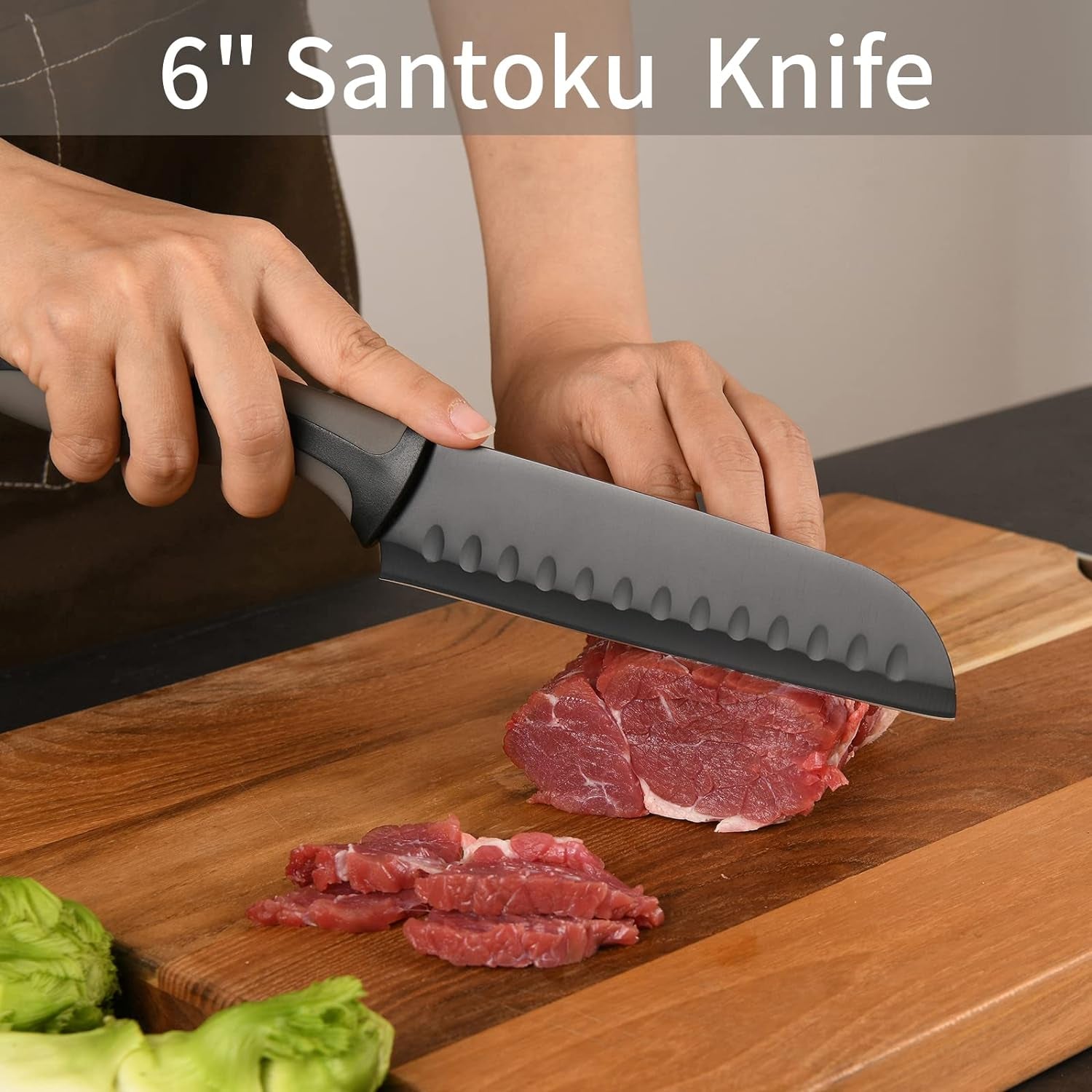 The KD Kitchen Knife Set features 10 ultra-sharp black stainless steel knives that are essential tools for any new home. With 2 cutting boards and safety sheaths included. this set is both practical and versatile. Dishwasher safe for easy cleaning. Upgrade your kitchen with this multifunctional set.