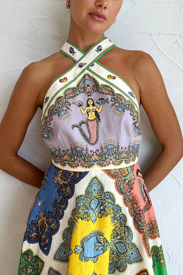 Ocean Legend Linen Blend Mermaid Print Halter Tie-up Midi Dress